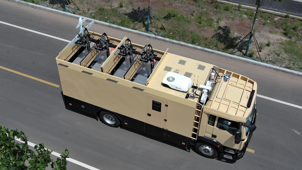 可用于搭載和調(diào)度多架無(wú)人機(jī)的重型卡車平臺(tái)。具備強(qiáng)大的承載和運(yùn)輸能力、多無(wú)人機(jī)聯(lián)合作業(yè)支持、以及多聯(lián)指揮調(diào)度功能。