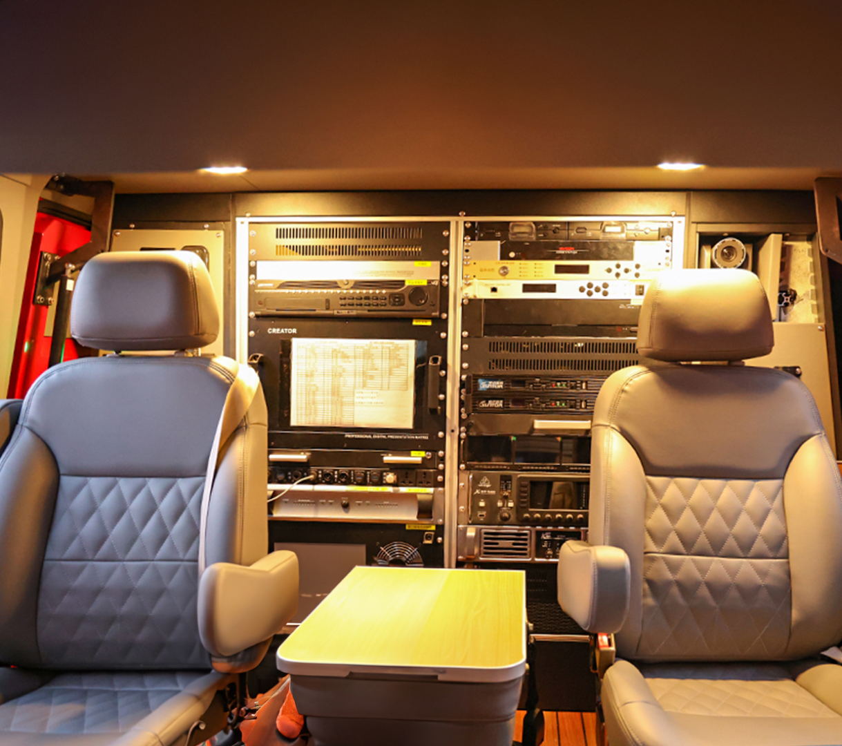 九瑞牌福特F550通信指揮車車內(nèi)平臺按功能分為三段,前部駕駛艙、中部操作艙、后部設(shè)備艙;操作艙設(shè)有兩個可旋轉(zhuǎn)座椅,方便進行通信設(shè)備操作;后部設(shè)備艙可配備電纜盤、發(fā)電機控制單元、UPS主機、蓄電池、雜物柜,設(shè)備配重布局合理,安裝平衡穩(wěn)固。