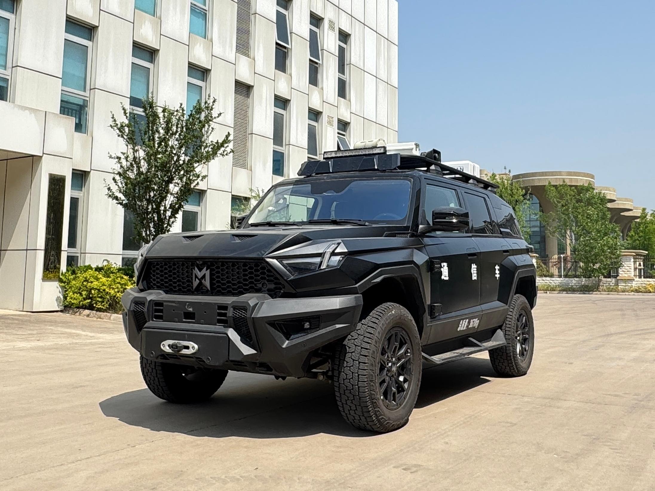 動(dòng)力系統(tǒng)采用增程式混合動(dòng)力,能輸出最大816匹馬力和1050N·m的最大扭矩,續(xù)航里程可達(dá)600km,可滿足長(zhǎng)距離、高強(qiáng)度任務(wù)需求。車輛整備質(zhì)量3500kg,尺寸為長(zhǎng)5096mm、寬2080mm、高2314mm,軸距2950mm。此外,車輛滿足公安B級(jí)防爆標(biāo)準(zhǔn),配備防爆涂層、TPE玻璃防爆膜和防爆胎等,安全性高。
